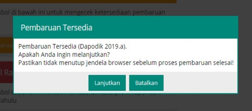 d) Maka ditampilkan keterangan bahwa Pembaruan Tersedia. Pembaruan Tersedia (Dapodik 2019.a) Apakah Anda ingin melanjutkan? Pastikan tidak menutup jendela browser sebelum proses pembaruan selesai!