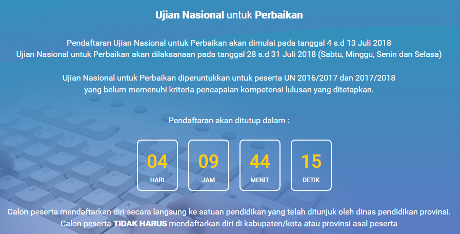 - Pendaftaran calon perserta UN untuk Perbaikan tahun 2018 dilaksanakan pada tanggal 4 – 13 Juli 2018.